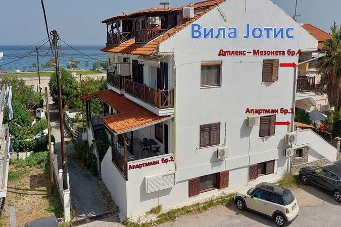 Вилата “ЈОТИС“ е убава , стандардно опремена вила и се наоѓа на 20 метри од плажа. Секој апартман има кујна стандардно опремена со кујнски инвентар,респиратор,голем фрижидер,ел.шпорет со рерна,купатило и вц,спална соба,тераса,тв,клима уред и ви-фи конекција.