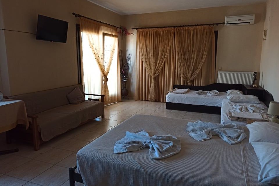 Студиоброј 4 (1/4) – многупространостудиосо огромна тераса (страниченпогледморе), целосноопременакујна, квалитетенмебел и сопствентоалет. Располагасобраченкревет, 2 стандардникревети и софа.