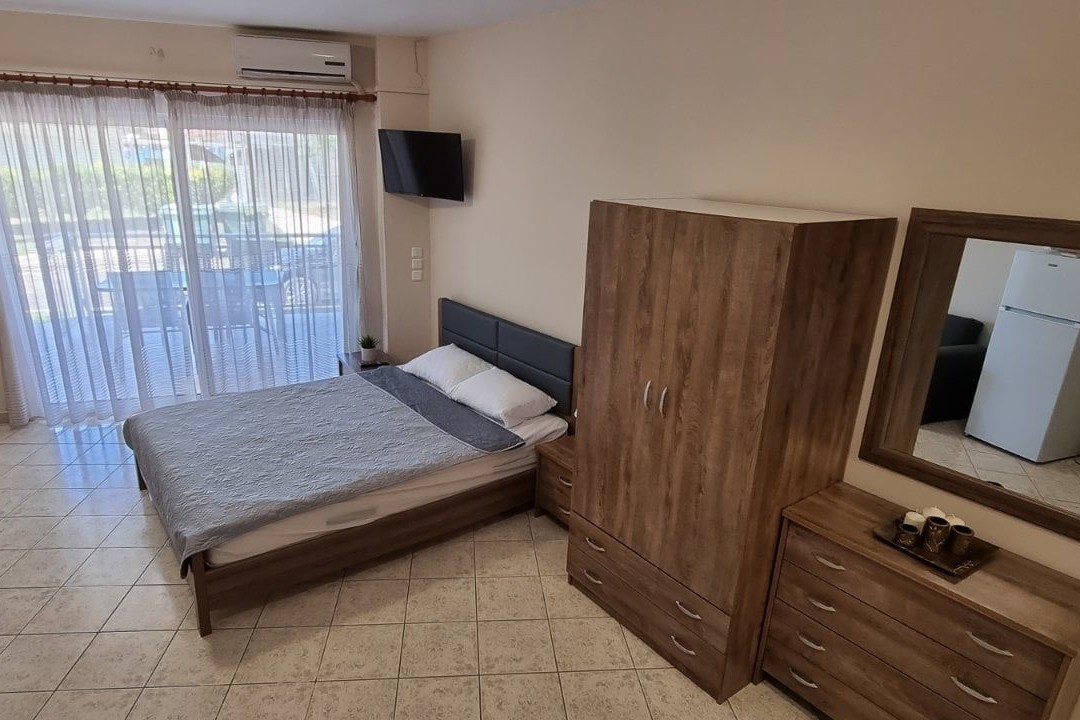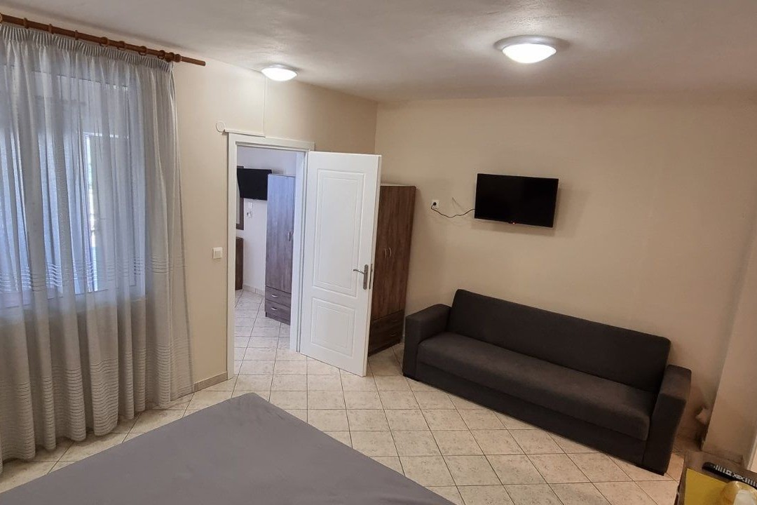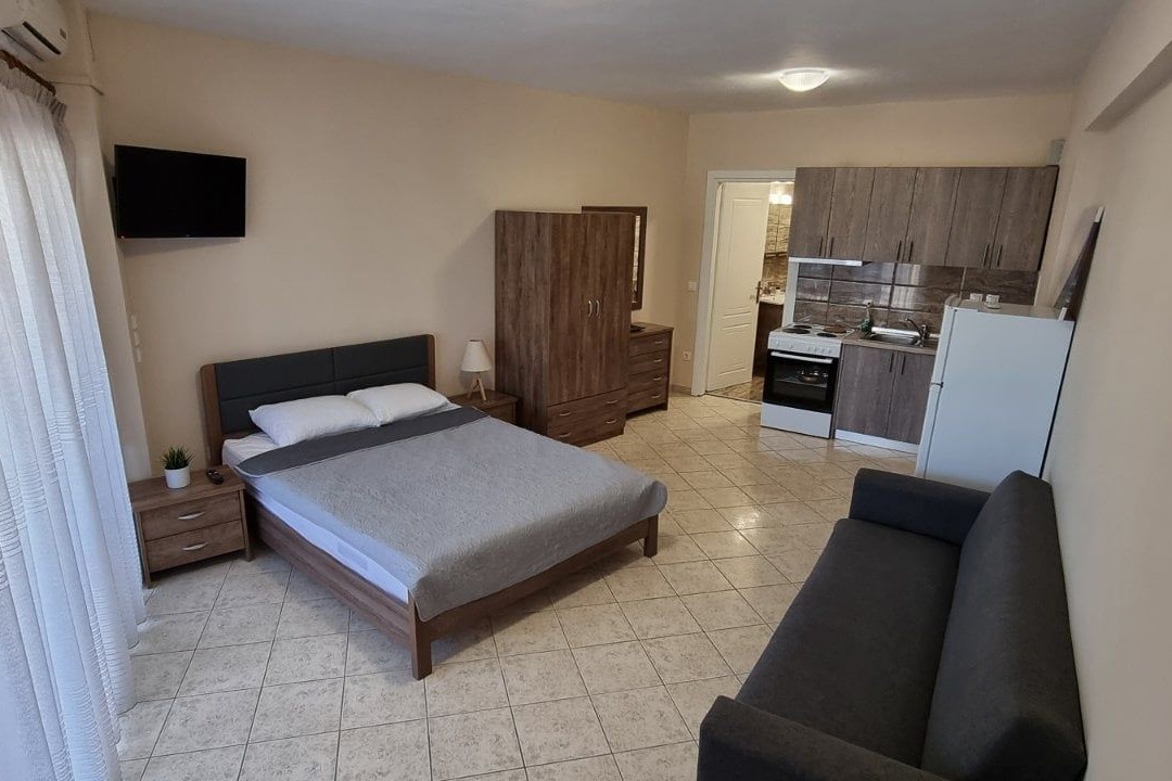 Студио бр. 1 – приземје. Располага со комплетно опремена кујна, тоалет, голема пространа тераса со директен поглед море, клима, ТВ, Wi-Fi, комарници и тенда. Има француски кревет и софа на пуштање.