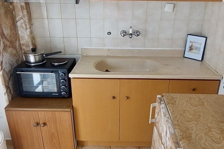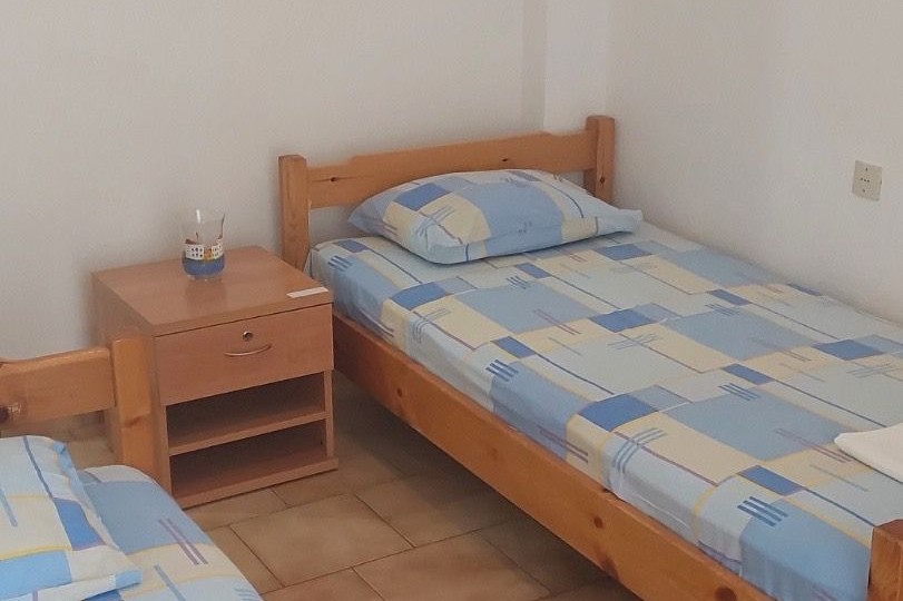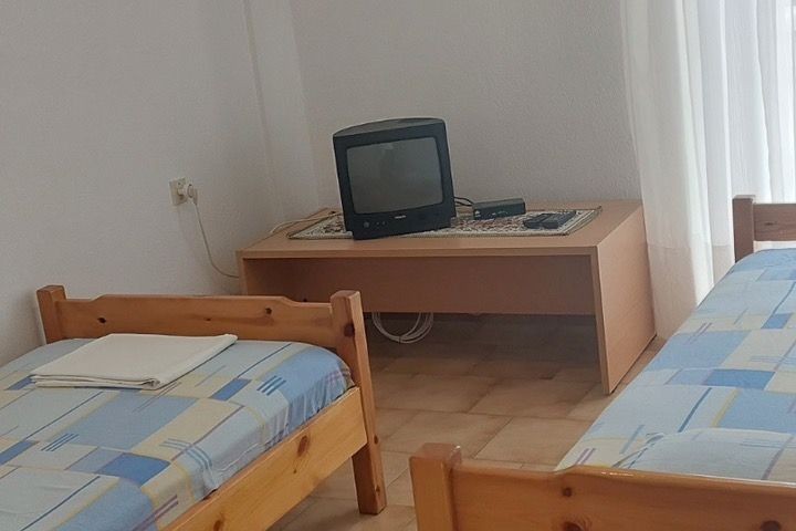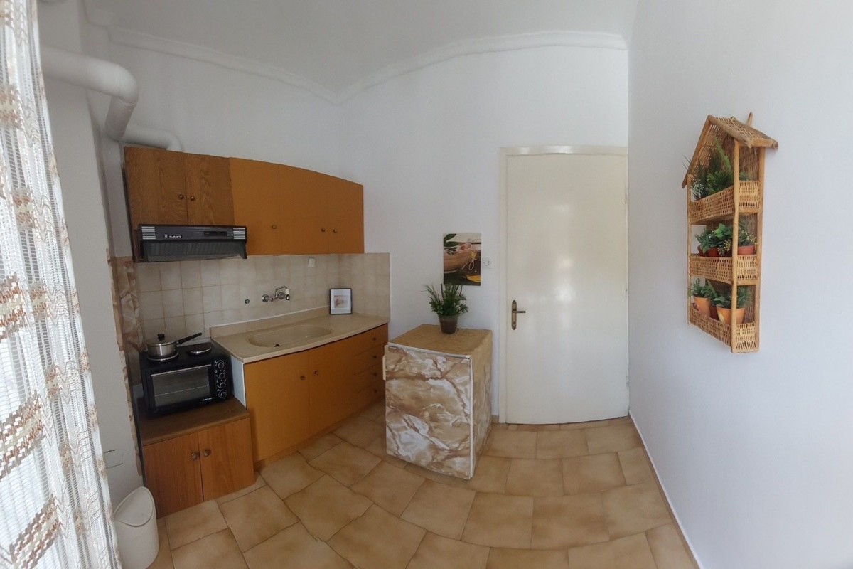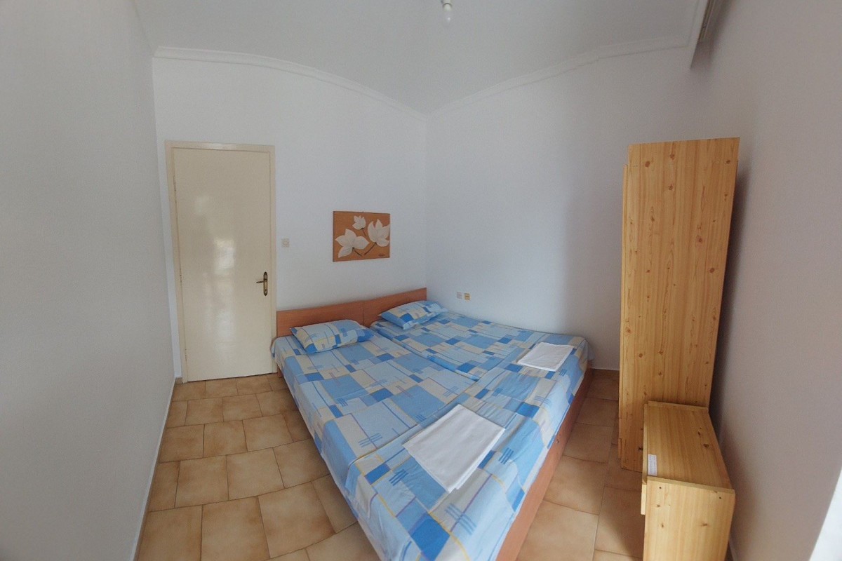 Дуплекс апартман број 1 (1/4 + 1) – се наоѓа на прв кат. Има пространа голема тераса со страничен поглед море. Има одделена посебна голема целосно опремена кујна, сопствен тоалет и малку постар, но сосема пристоен мебел, има 2 одвоени спални соби, во кои има по 2 стандардни кревета со можност да се додаде дополнително легло за дете до 12 год. или креветче за бебе.