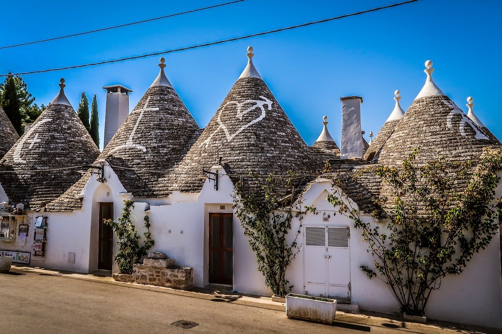 АЛБЕРОБЕЛО – На 40 километри од Бари се наоѓа ова градче во областа Апулија, изградено во стилот на традиционалната медитеранска градба, без гипс, од сув камен, стара неколку илјади години. Ѕидовите на куќите се бели, а покривите се куполи и често имаат шила (пинаколи) на врвовите.